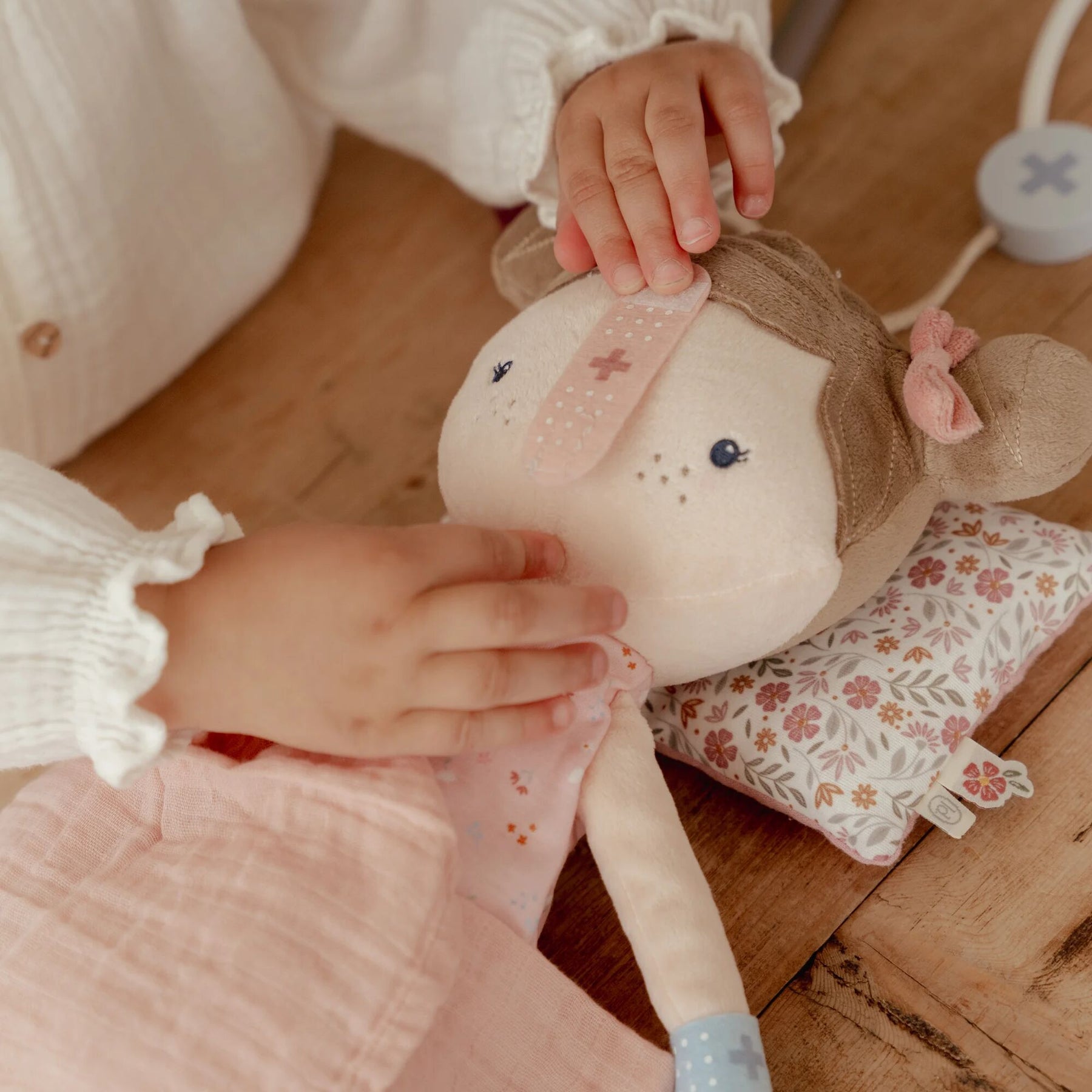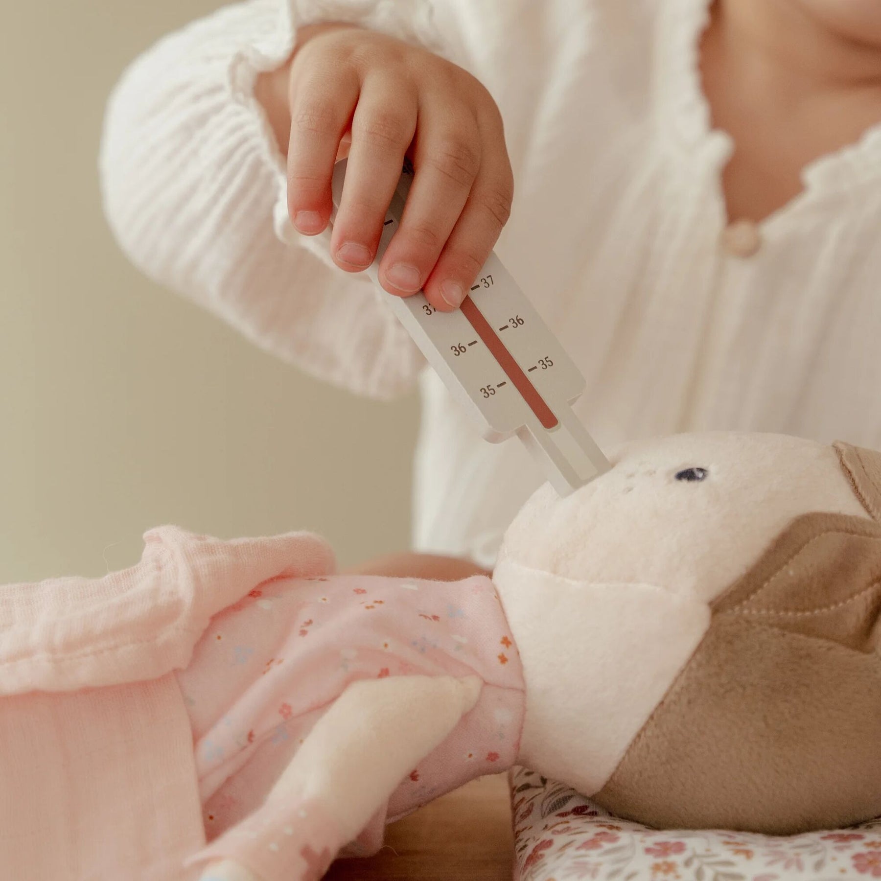 Doctor, can you take a look? With this complete wooden doctor’s set, your little one is fully prepared to take care of patients. The fabric doctor’s bag contains all the essential medical tools, such as a thermometer, syringe, bandages, stethoscope, and blood pressure monitor. Even a doctor’s cap is included! Perfect for imaginative role-playing and get ting familiar with doctor visits. Who’s the next patient?