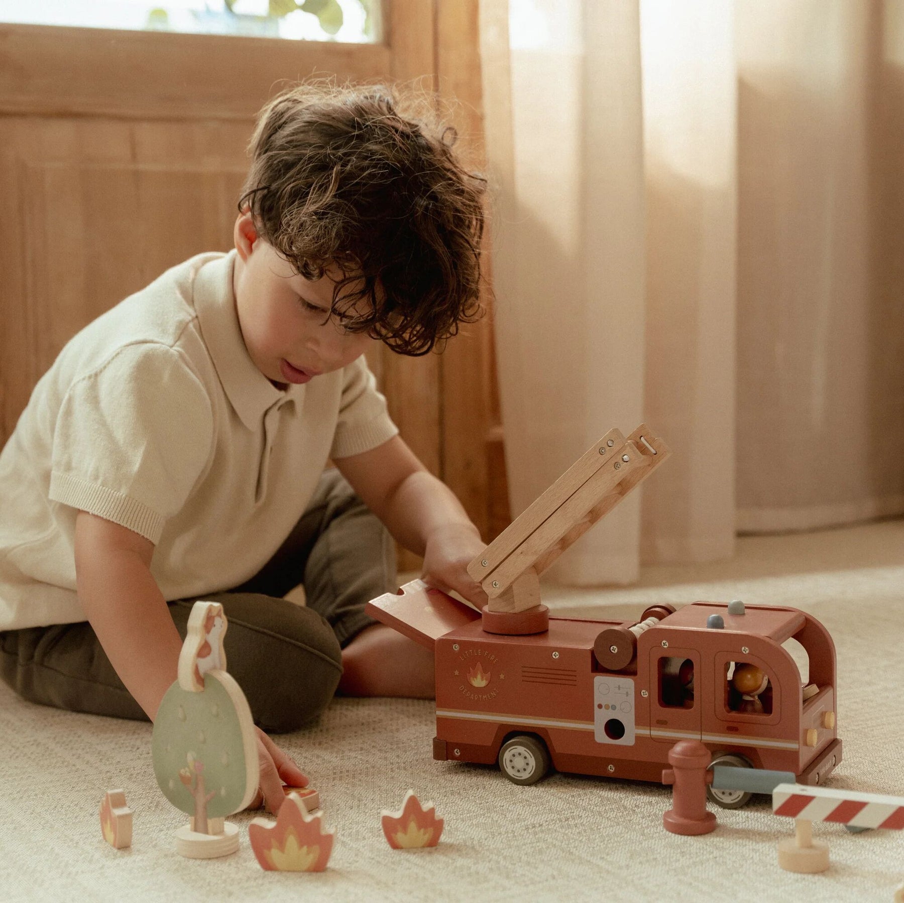 Rescue the cat from the tree! This wooden fire truck has an extendable ladder and a detachable fire hose that can be connected to the hydrant or the fire truck. Includes four firefighters, flames, and a fire hydrant. Perfect to combine with the fire station for even