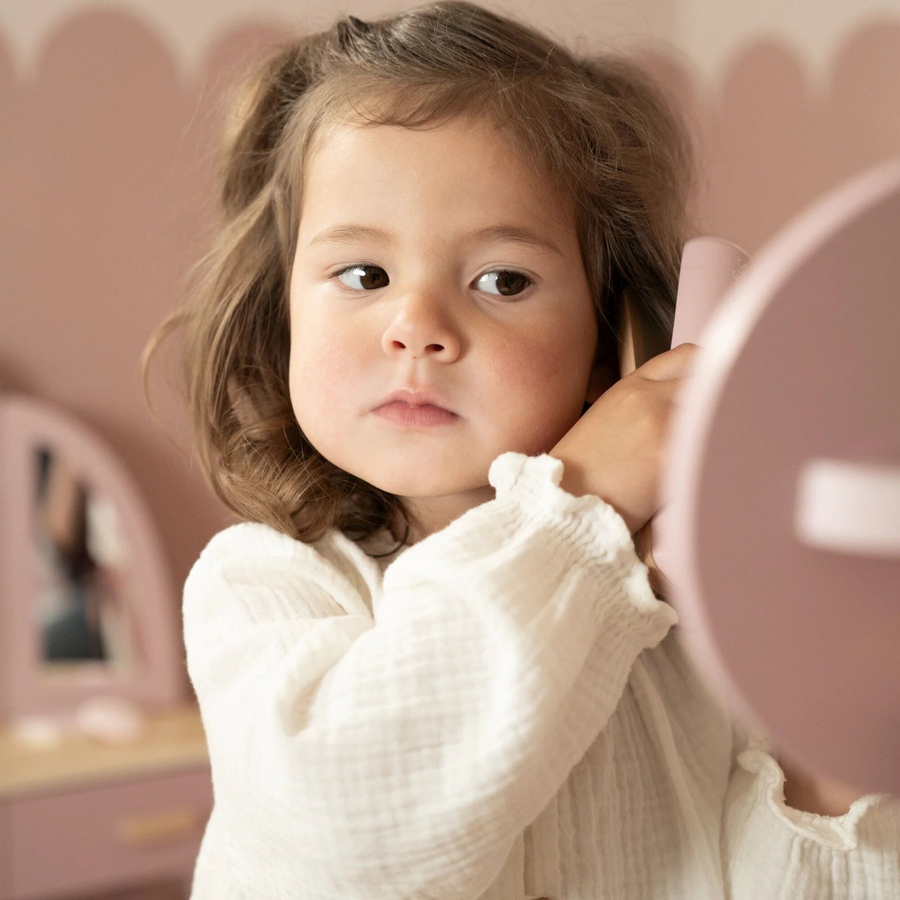 Cut, blow-dry, and style like a real hairdresser! With this beautiful wooden hairdressing set, your little one has everything at hand to create the most beautiful hairstyles. The adjustable pink hip belt is filled with professional accessories, such as a toy scissors, a hairdryer, a straightener, a clipper, a brush, shampoo, hairspray, and a mirror. Perfect for role-playing and endless fun. Who will be the first in the salon chair?