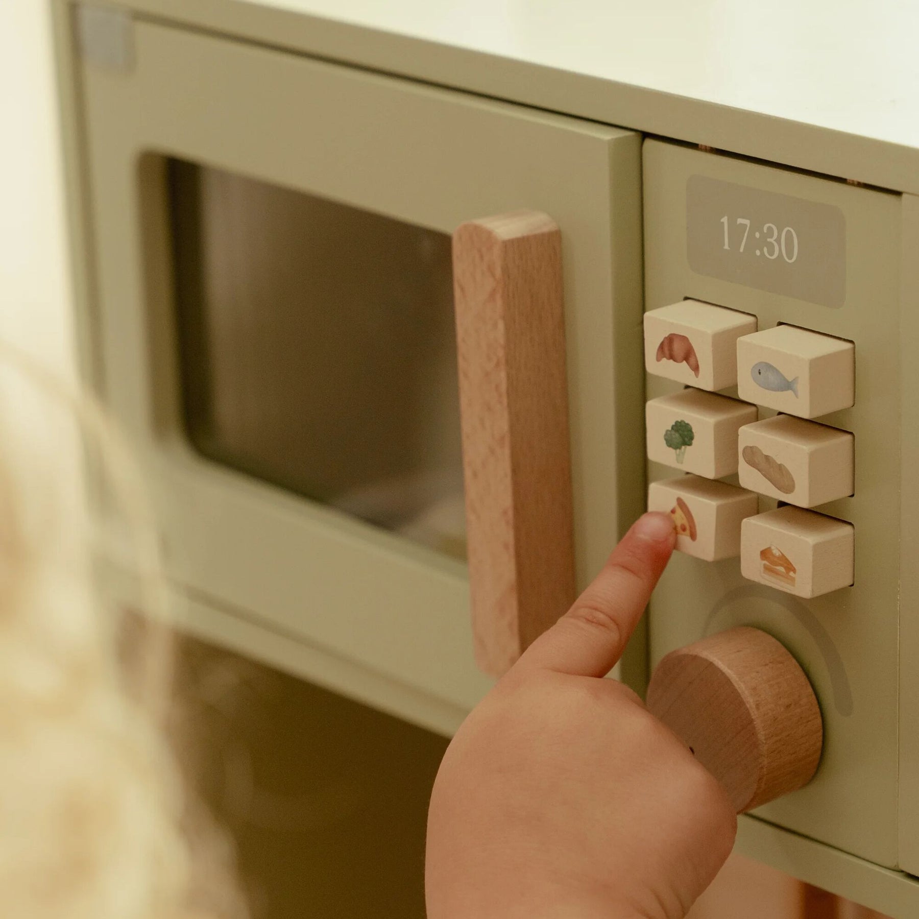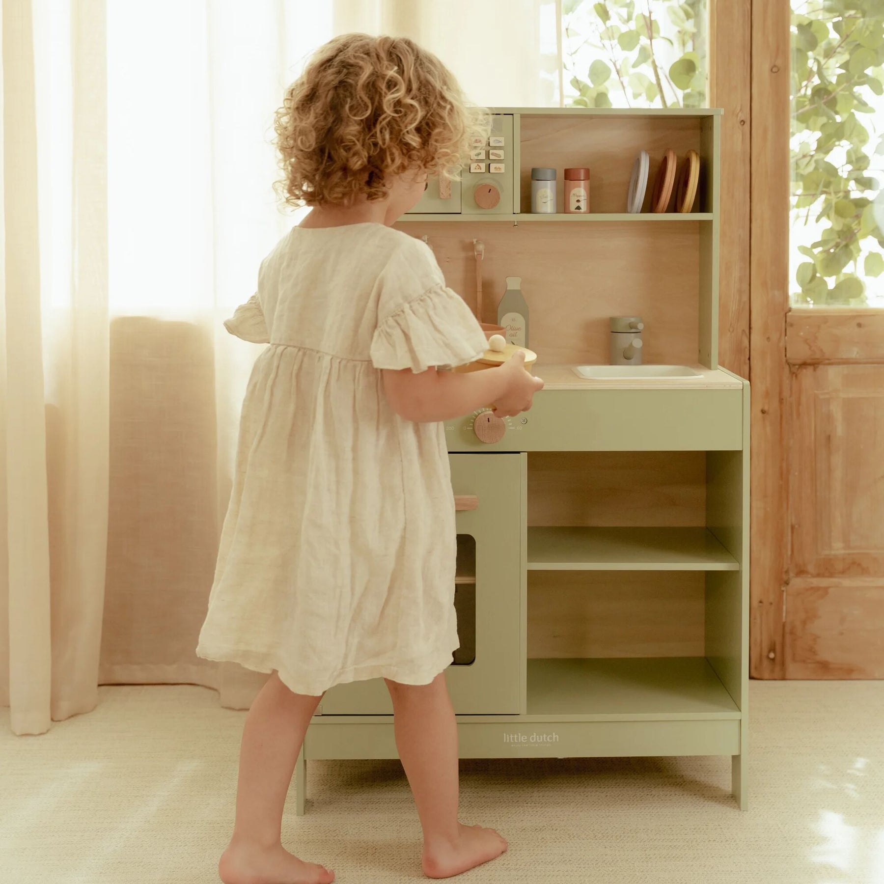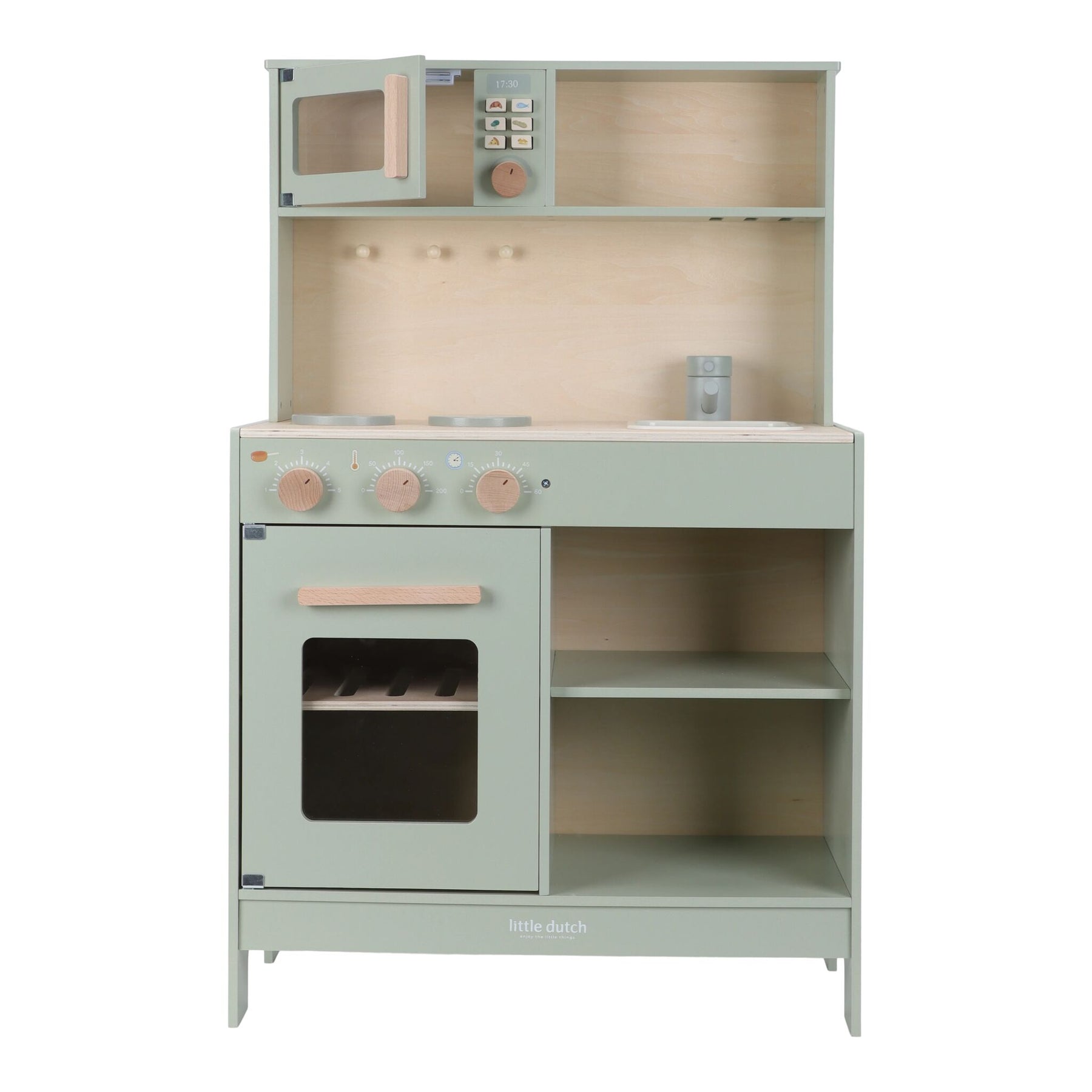 Little chefs can get to work in this beautiful mint-colored wooden play kitchen! Bake a delicious cake in the oven, cook fresh vegetables on the stove, or fry an egg in the pan. The kitchen comes fully equipped with two pans, cooking utensils, three plates, and a sink to wash hands. Also included: a bottle of olive oil, a salt and pepper set, and a cupboard to neatly store groceries. The microwave has real knobs with illustrations for extra play fun. What’s cooking today?
