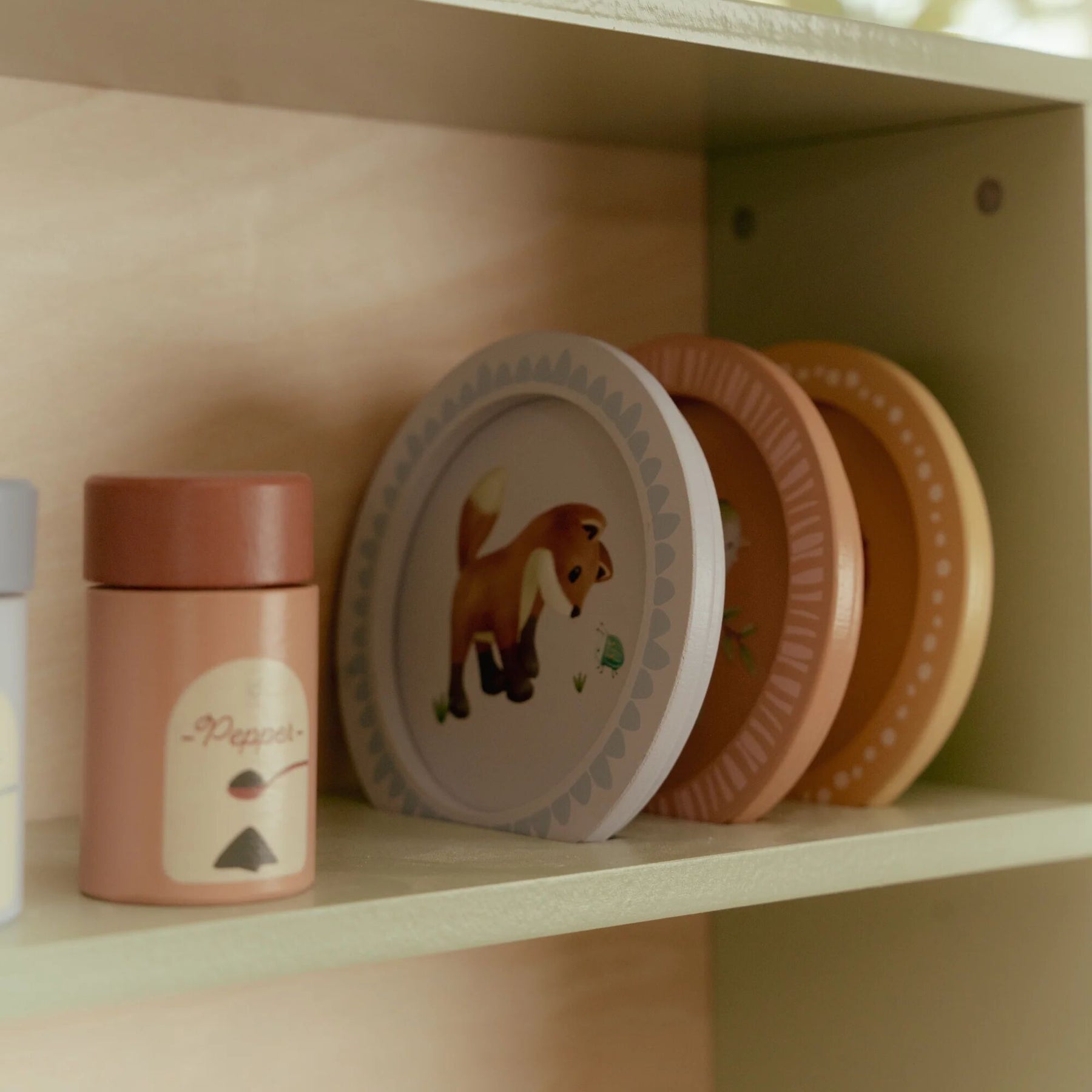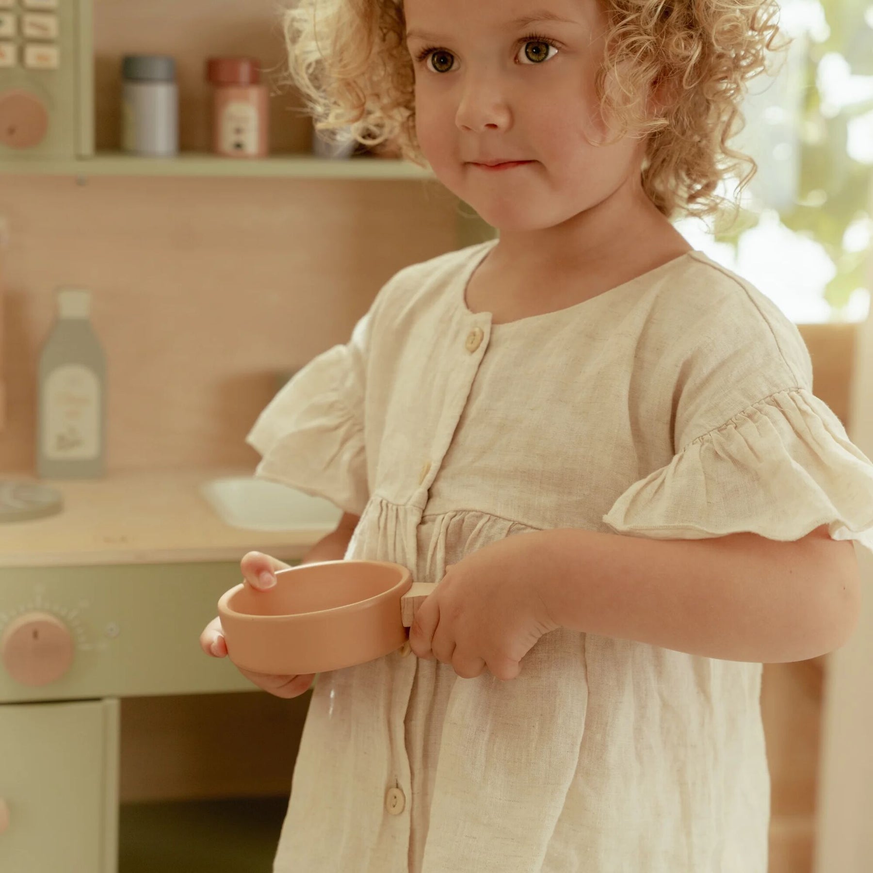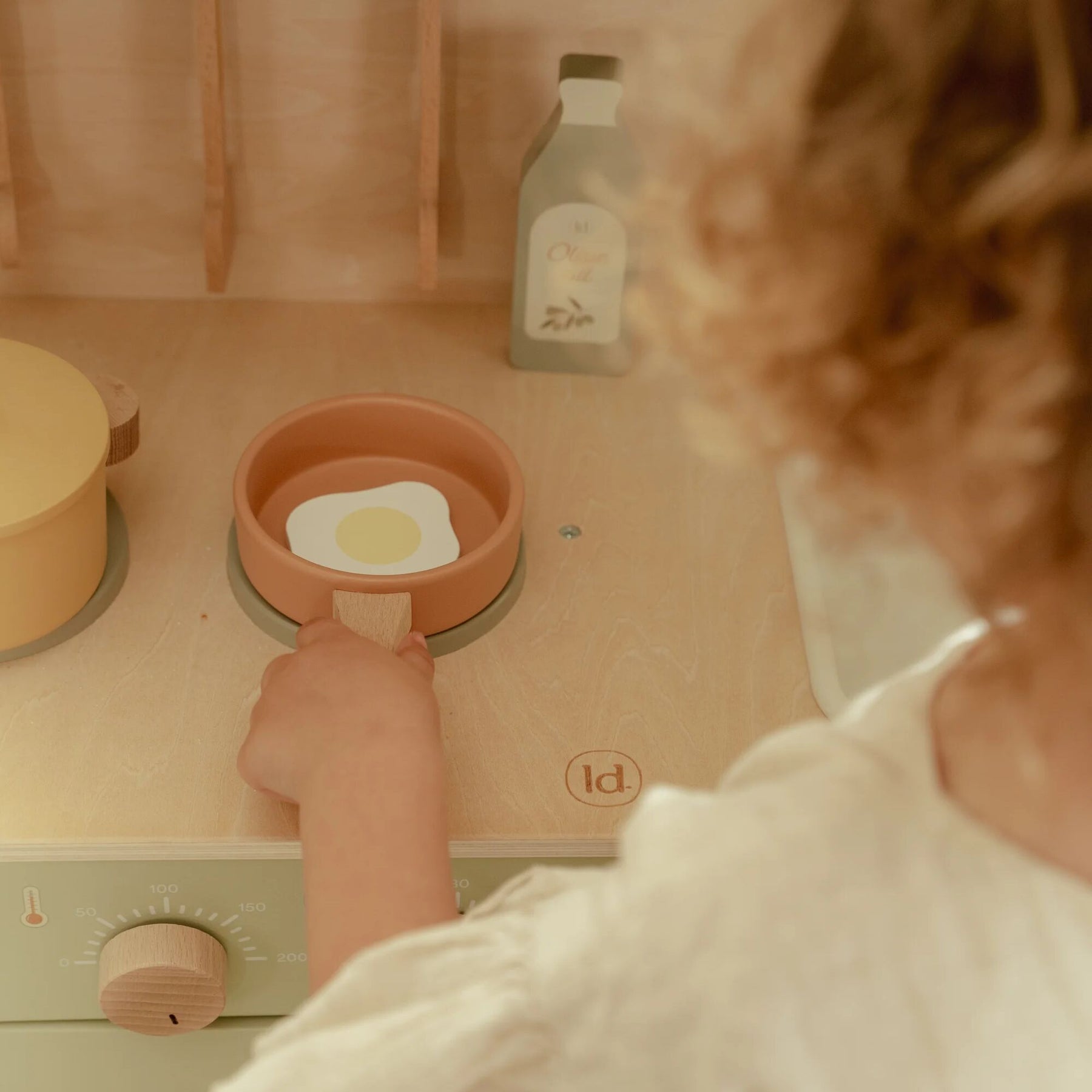 Little chefs can get to work in this beautiful mint-colored wooden play kitchen! Bake a delicious cake in the oven, cook fresh vegetables on the stove, or fry an egg in the pan. The kitchen comes fully equipped with two pans, cooking utensils, three plates, and a sink to wash hands. Also included: a bottle of olive oil, a salt and pepper set, and a cupboard to neatly store groceries. The microwave has real knobs with illustrations for extra play fun. What’s cooking today?