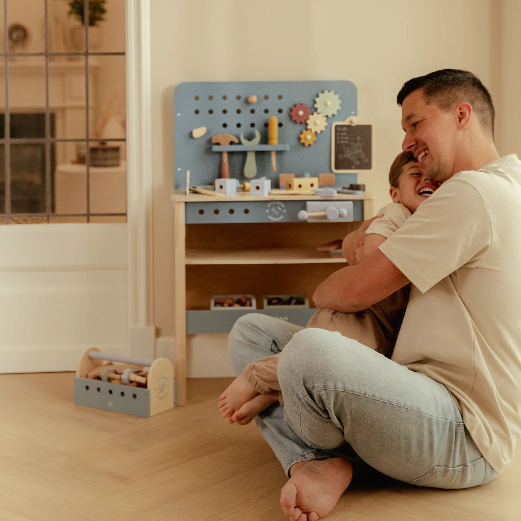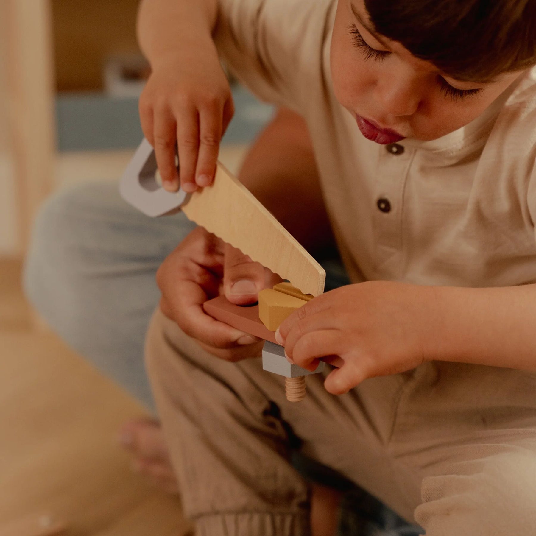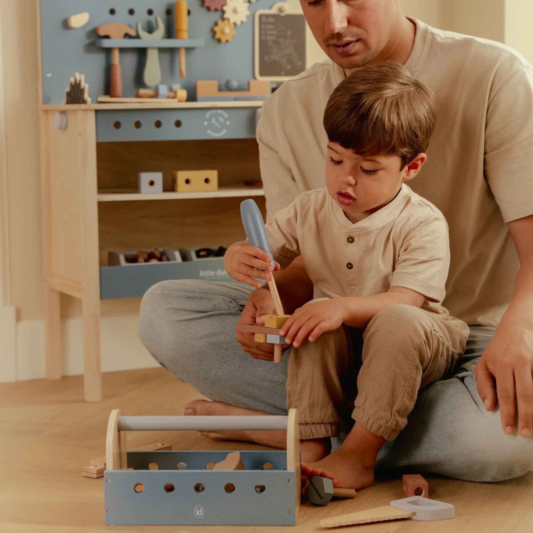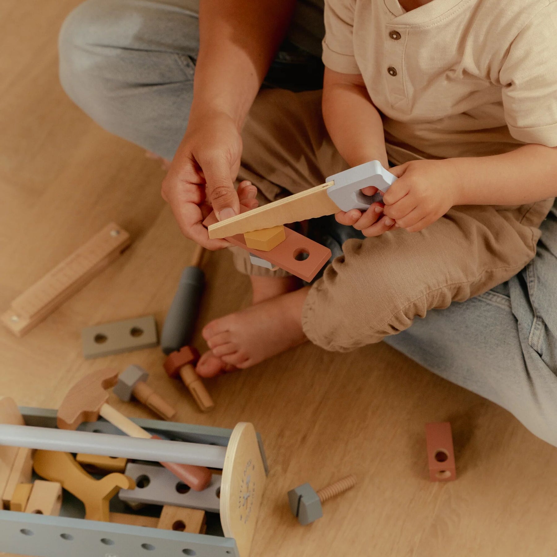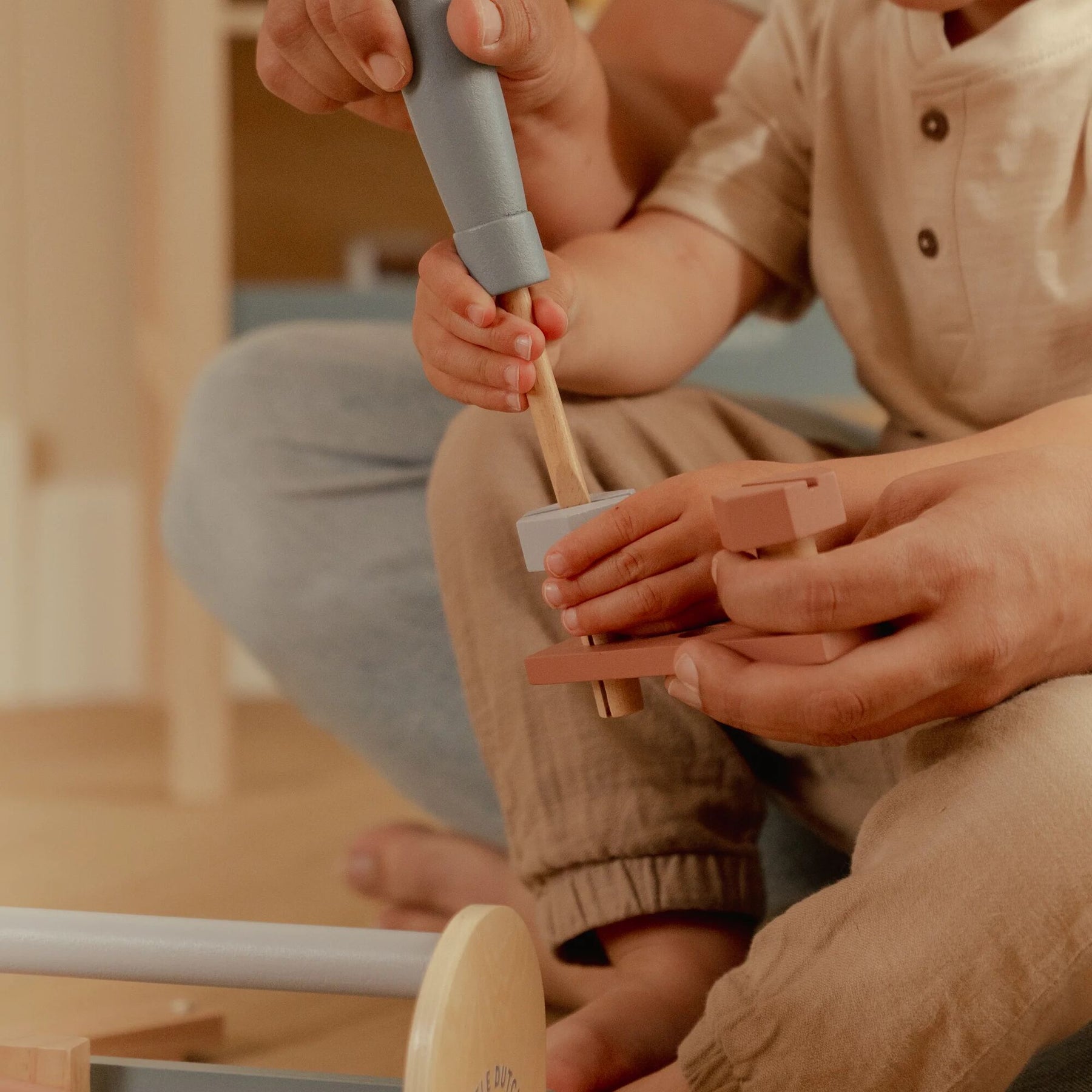 Everything a little carpenter needs! This wooden toolbox includes a hammer, screwdriver, and wrench—perfect for building the most wonderful creations. But that ’s not all – the sides of the box can also be used as a pounding bench! This way, little ones can hammer and screw while playfully developing their motor skills and creativity. Ready to get started?