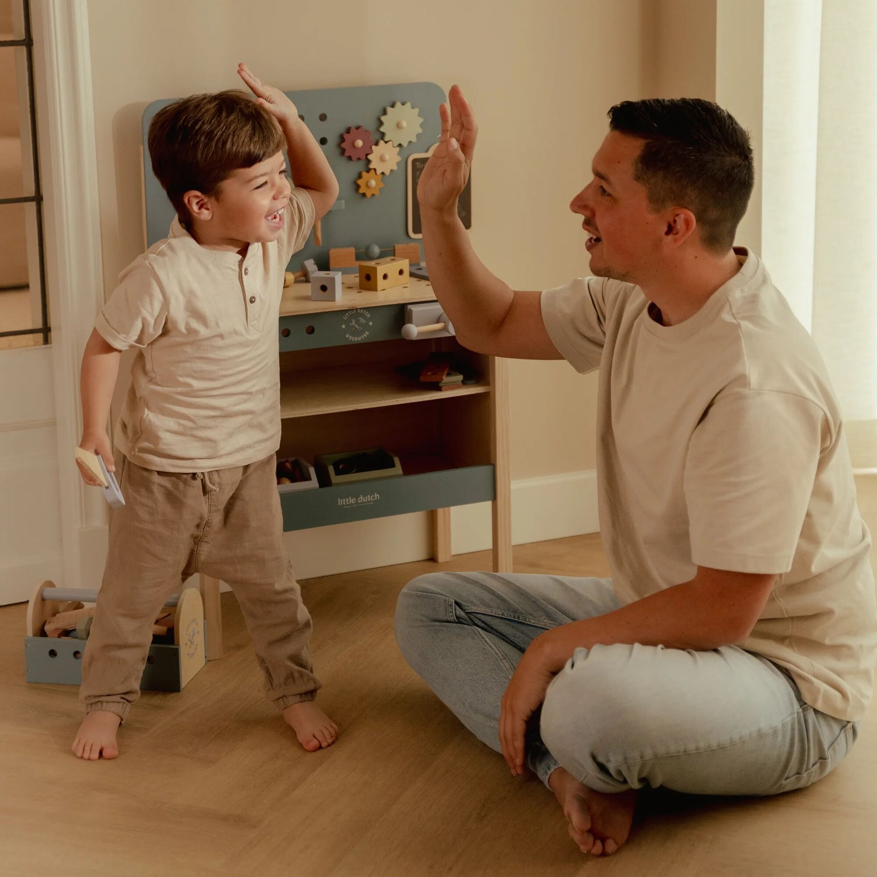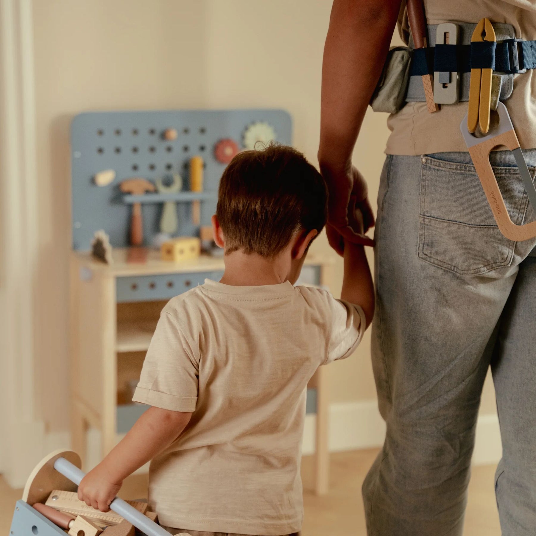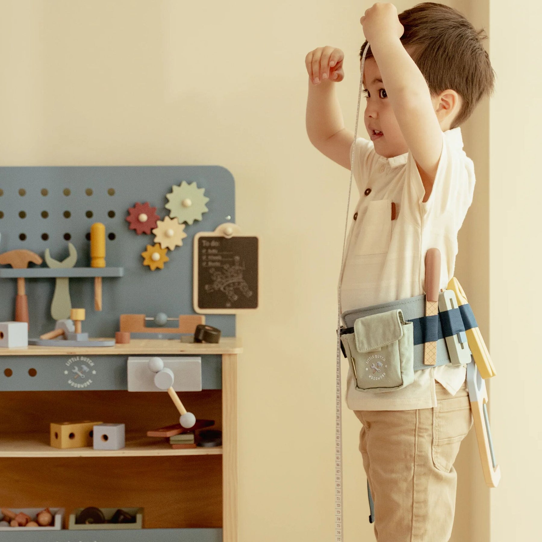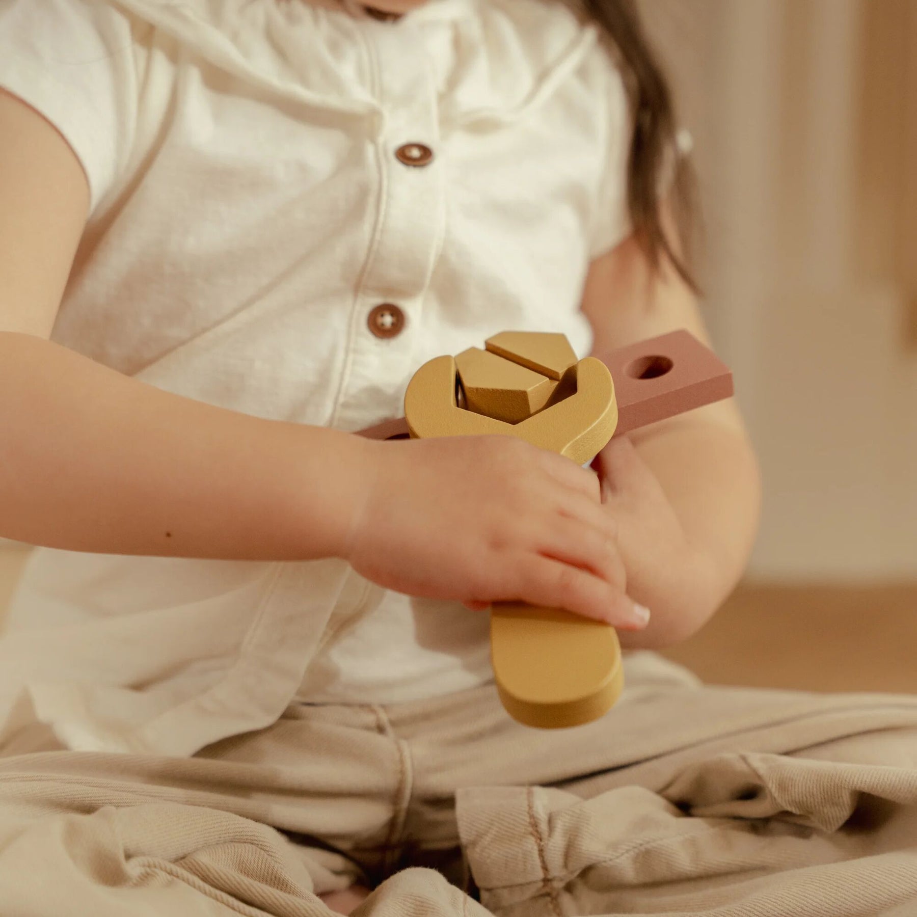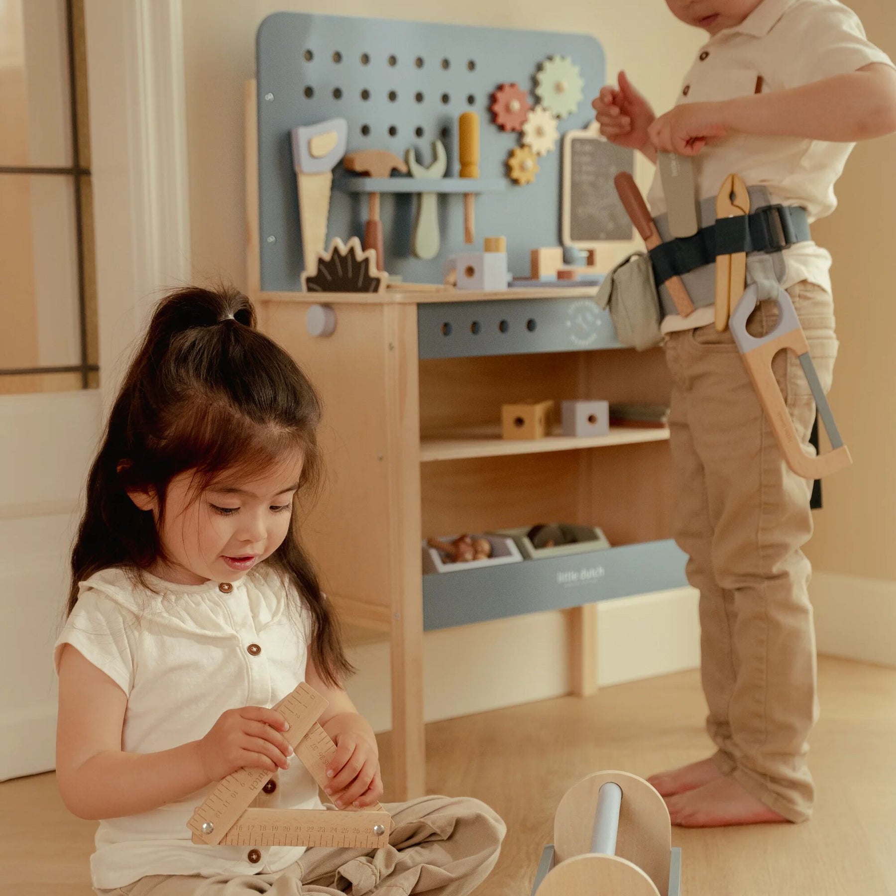 Everything a little carpenter needs! This wooden toolbox includes a hammer, screwdriver, and wrench—perfect for building the most wonderful creations. But that ’s not all – the sides of the box can also be used as a pounding bench! This way, little ones can hammer and screw while playfully developing their motor skills and creativity. Ready to get started?
