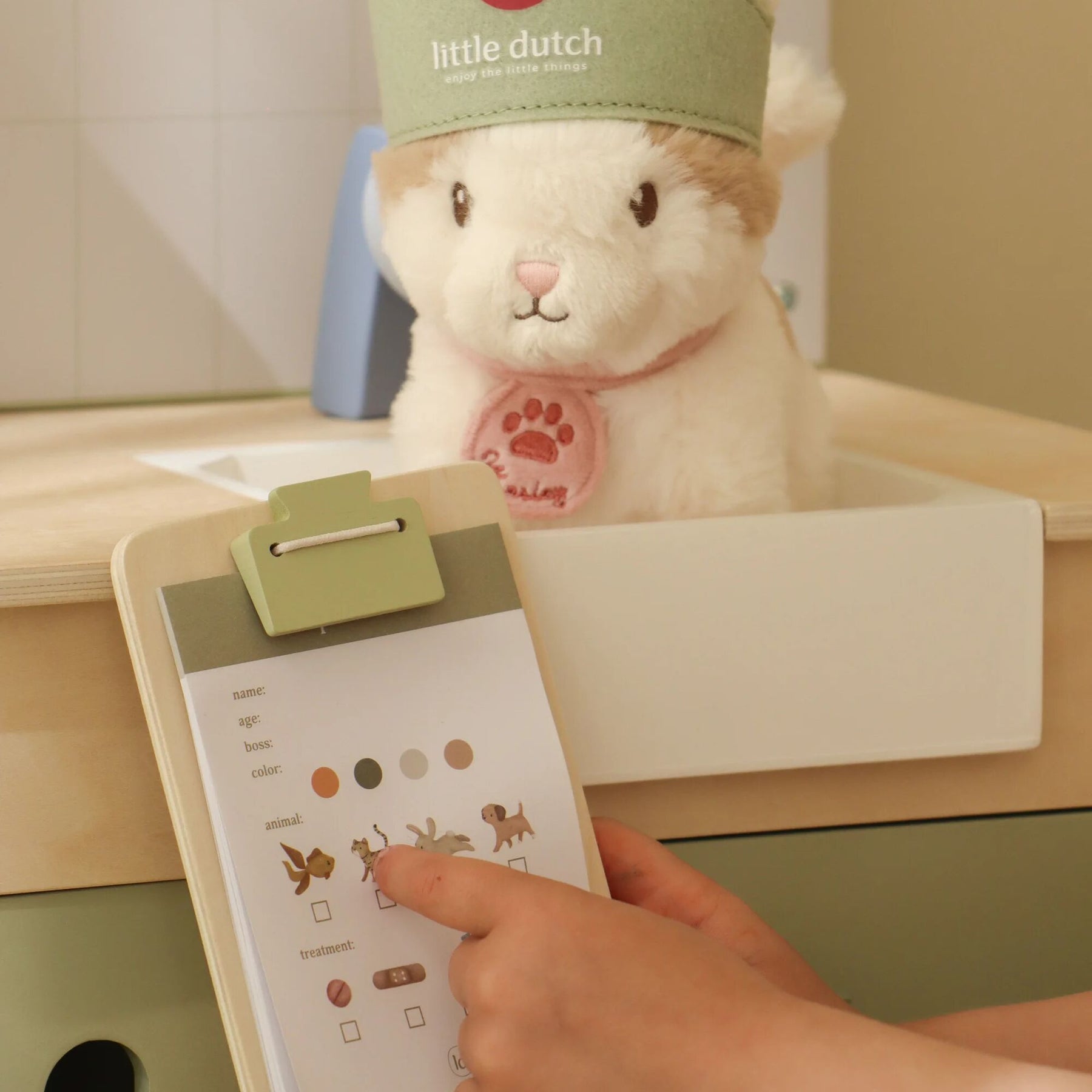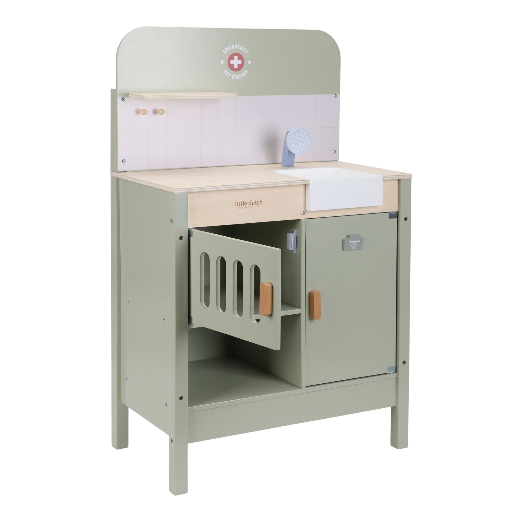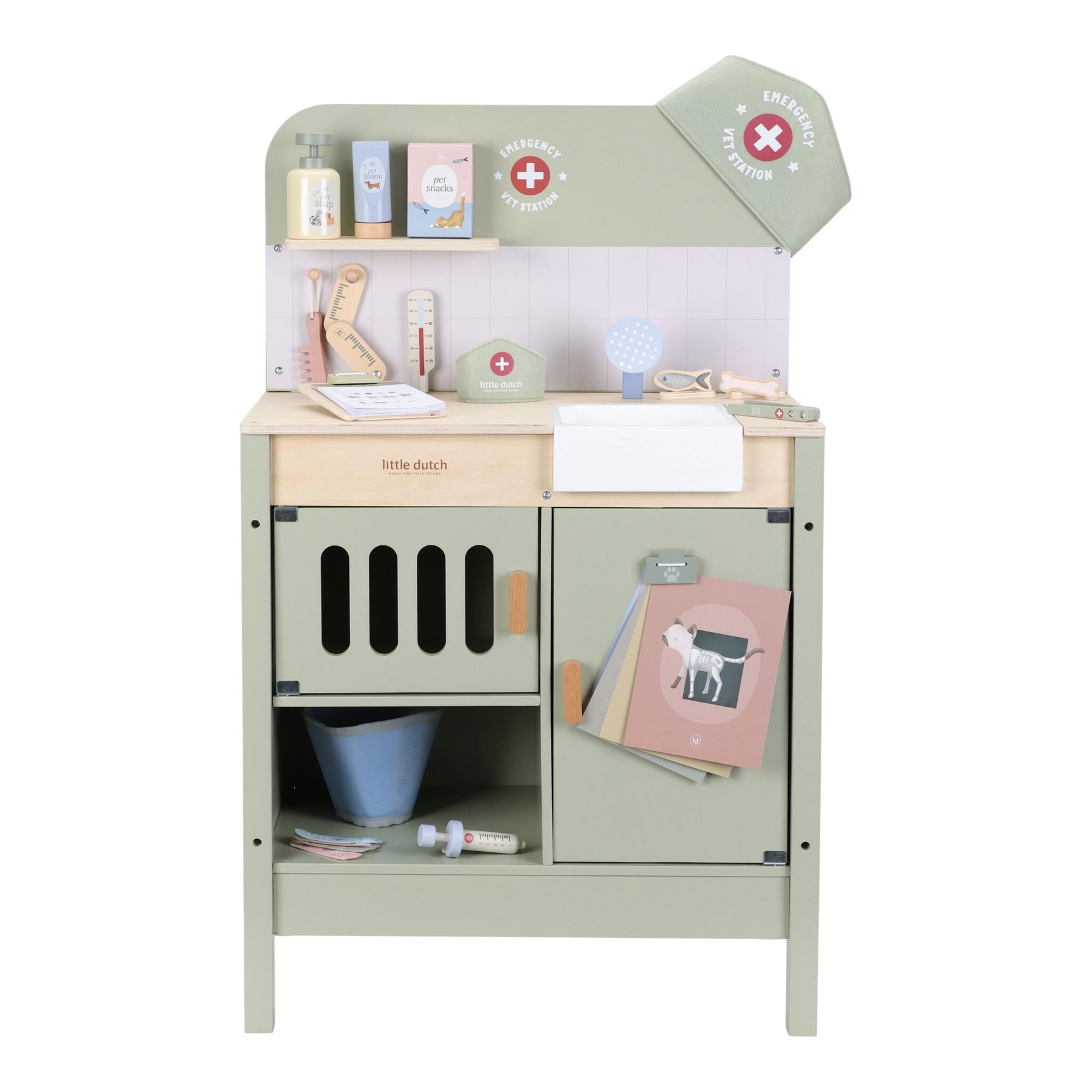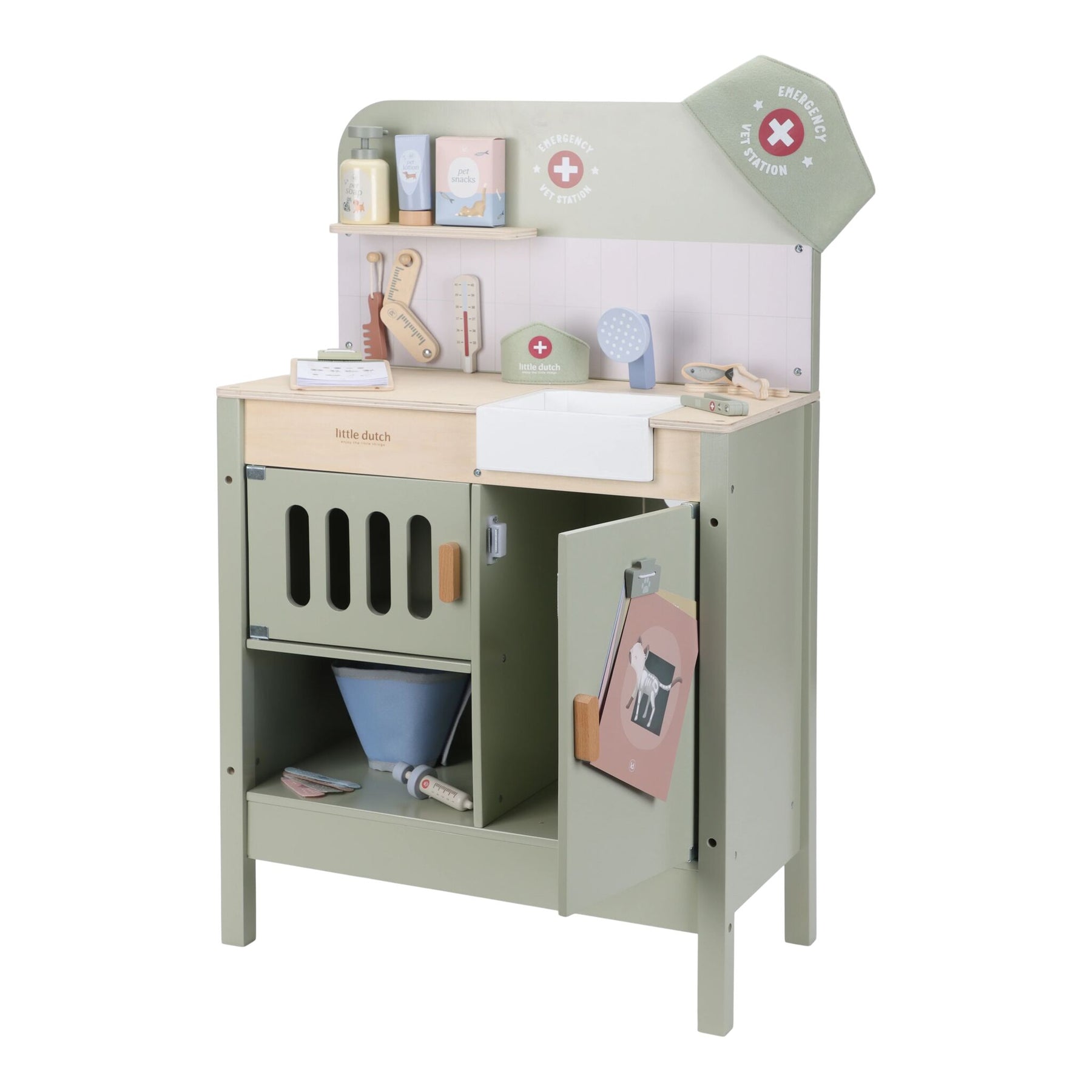 Do you take good care of sick stuffed animals and toy pets? With this extensive wooden veterinary clinic, your little one can fully immerse themselves in the role of a real vet. The set contains everything needed to care for pets, such as a retractable shower head with a sink, a comb, a thermometer, a syringe, and bandages. Also included are a fabric headband and a special clip to display medical illustrations and X-rays. Time for the next patient!