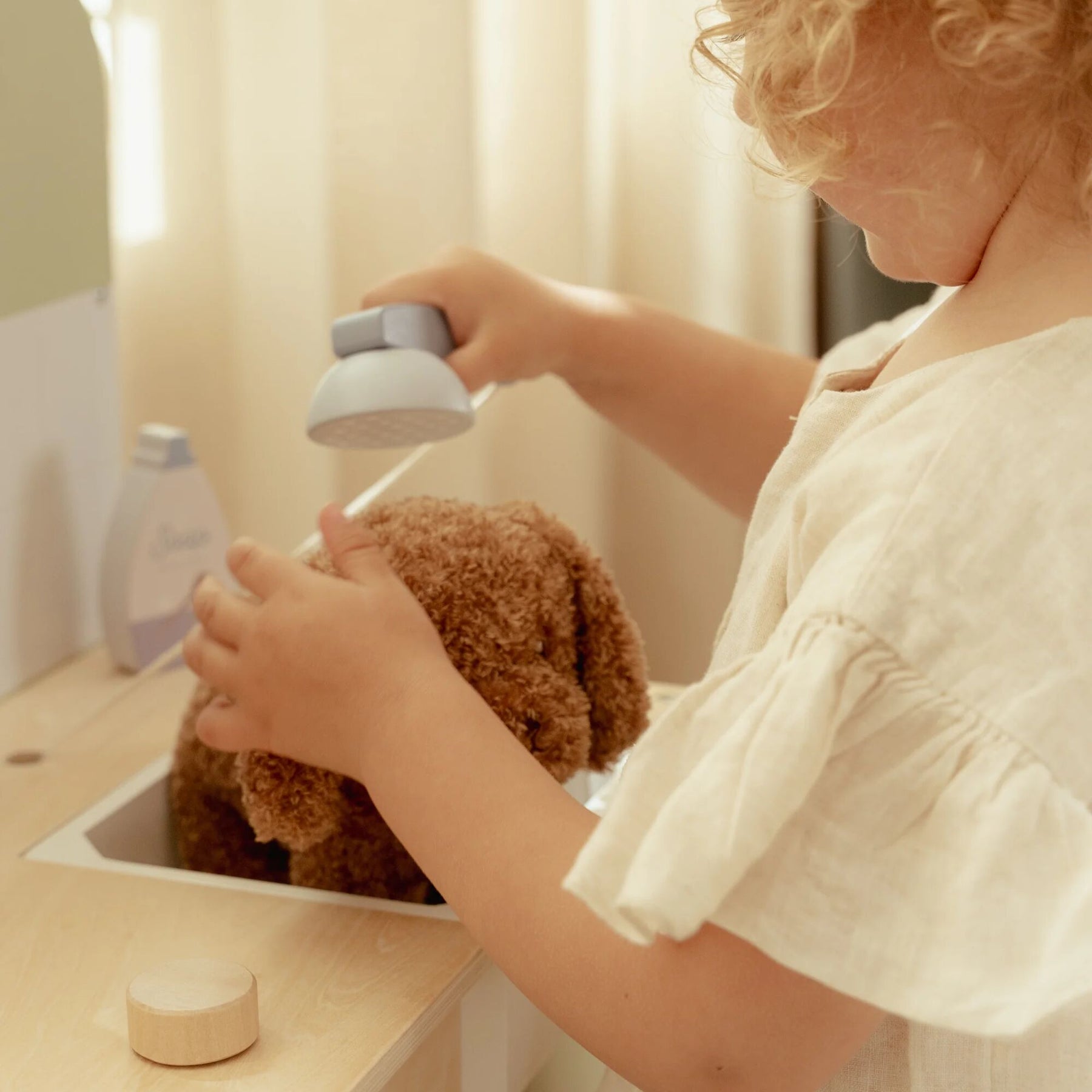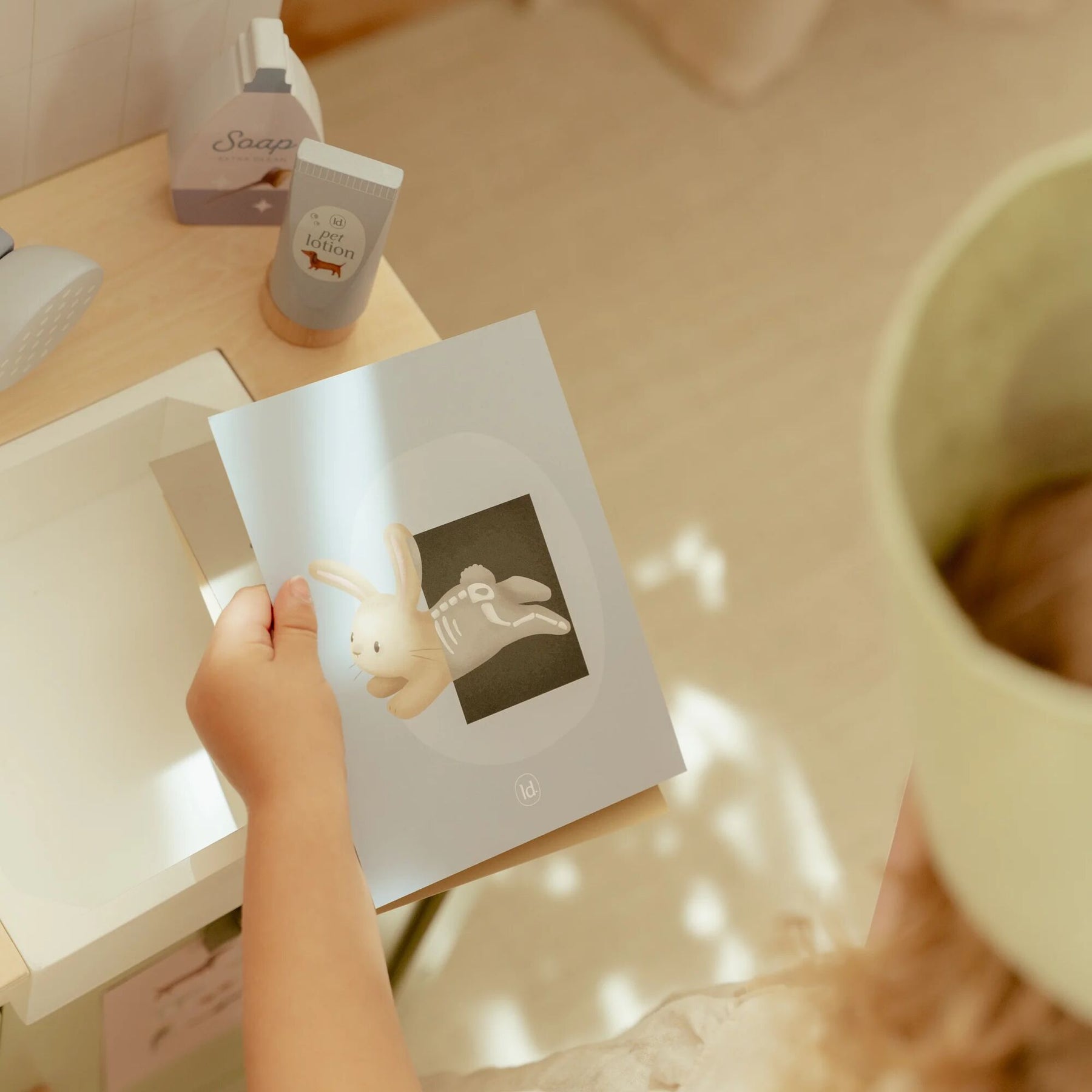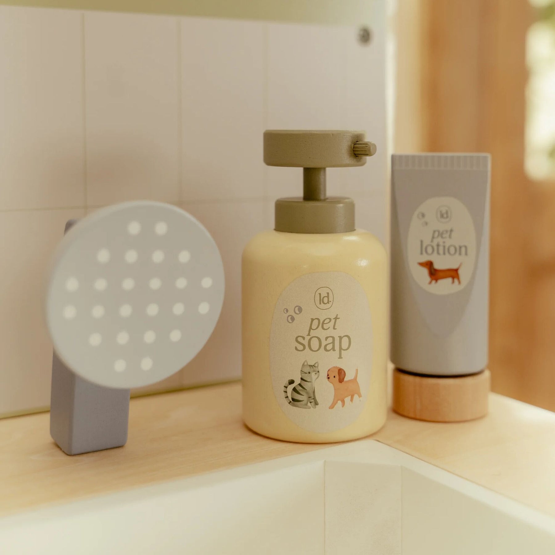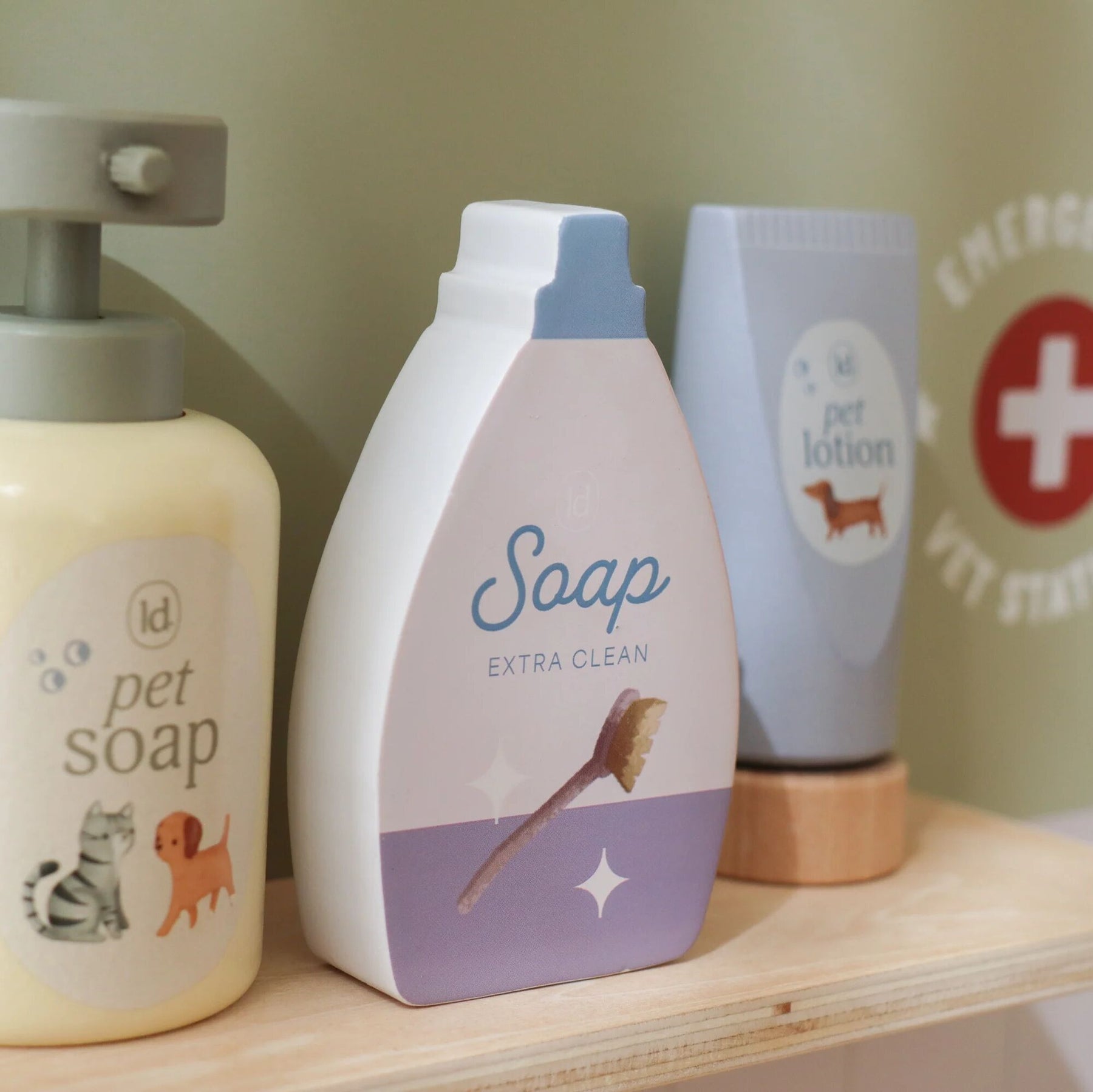 Do you take good care of sick stuffed animals and toy pets? With this extensive wooden veterinary clinic, your little one can fully immerse themselves in the role of a real vet. The set contains everything needed to care for pets, such as a retractable shower head with a sink, a comb, a thermometer, a syringe, and bandages. Also included are a fabric headband and a special clip to display medical illustrations and X-rays. Time for the next patient!