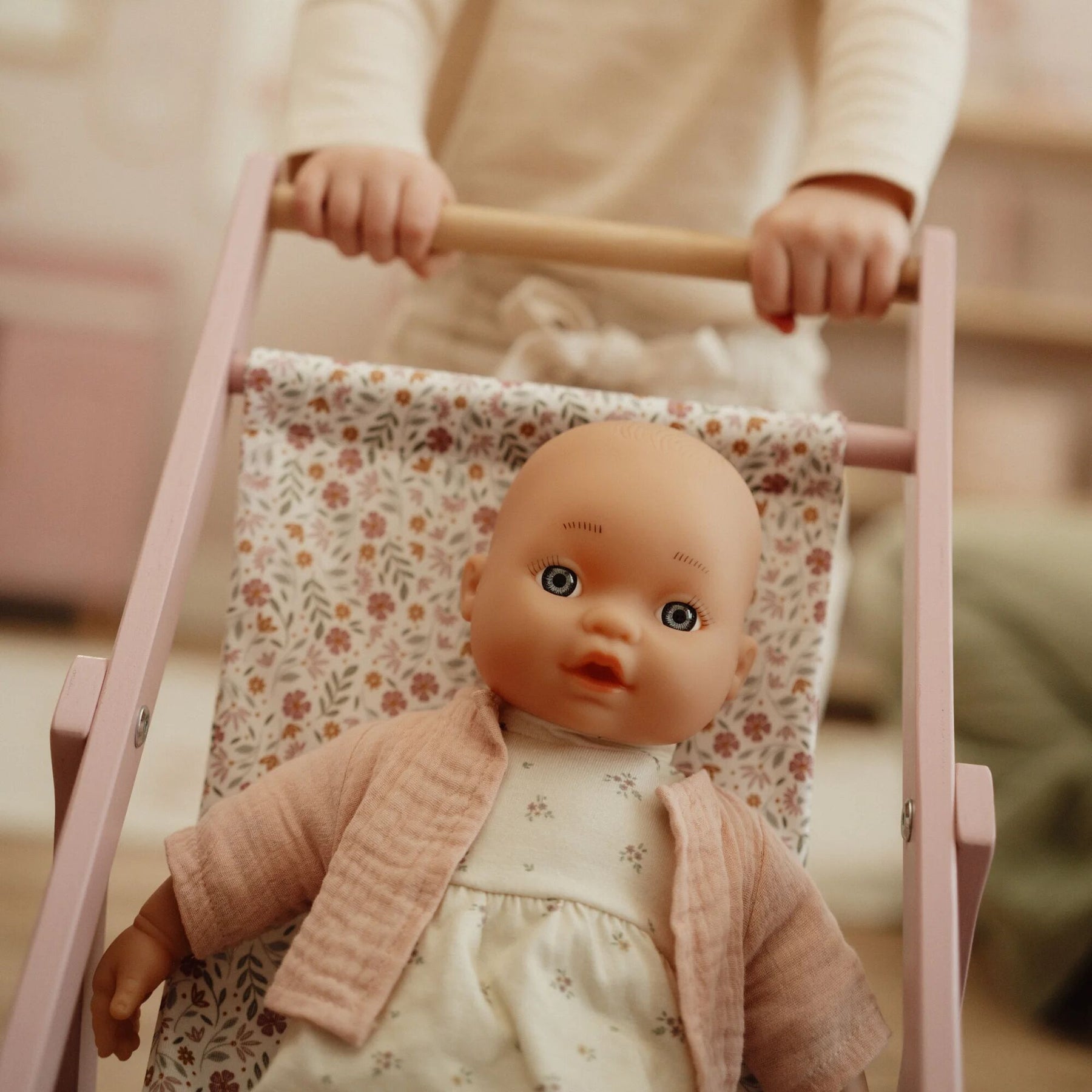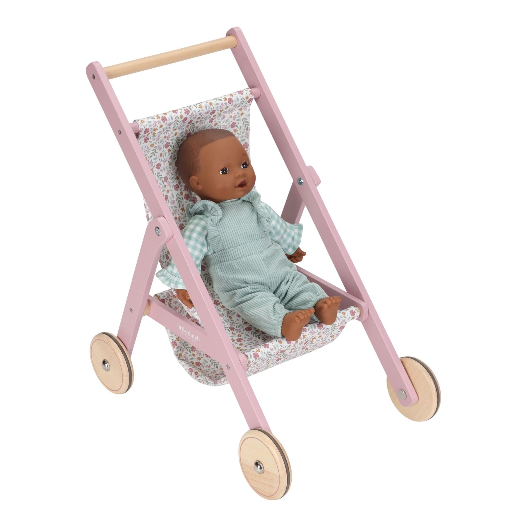 This wooden doll stroller is the perfect companion for walks with your doll. The sturdy wooden construction and rubber wheels ensure a smooth ride while protecting your floor. The seat is covered with the romantic Soft Flowers design, giving the stroller a charming look. Whether playing indoors or outdoors, your doll can always join in on an adventure with this stroller. Endless walking fun guaranteed!